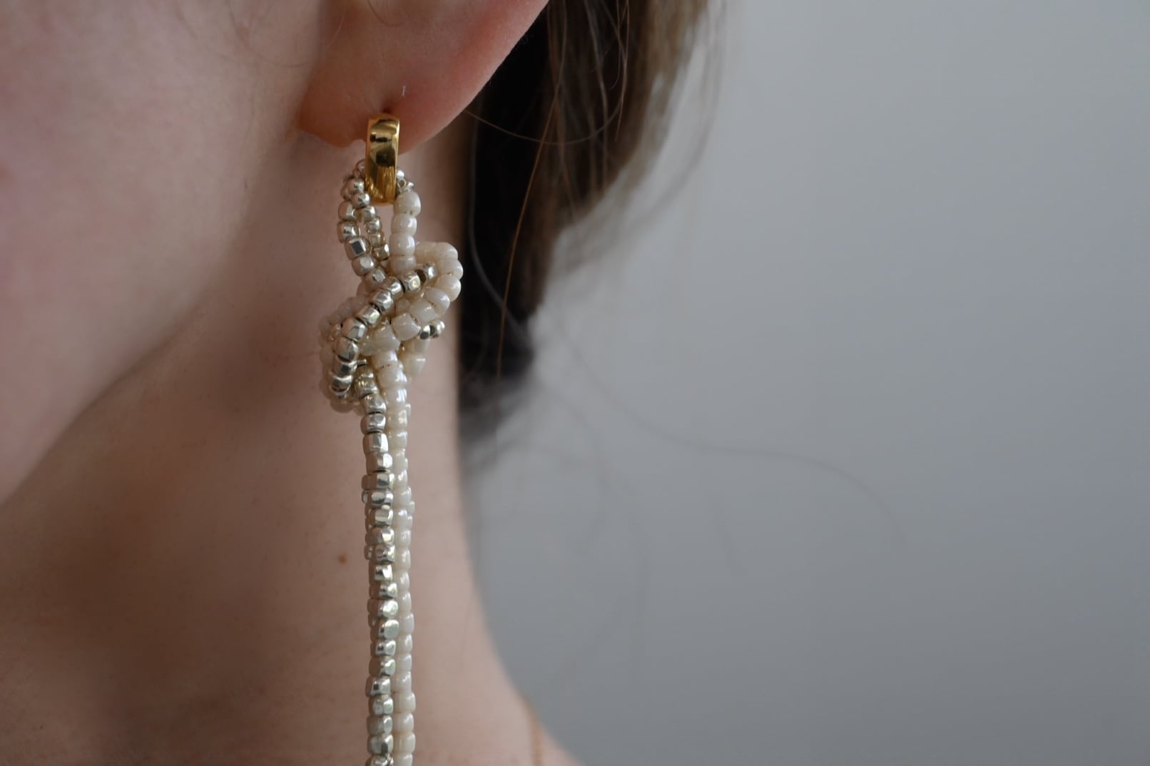 アイボリーとシルバーのカラーは顔馴染みが良く、ゴールドのアクセサリーとコーディネートしても素敵です。