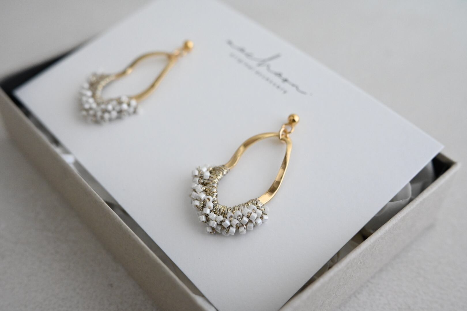 艶のある陶器のようなカラーの極小のカットビーズを金糸で編み込んだピアスです。
