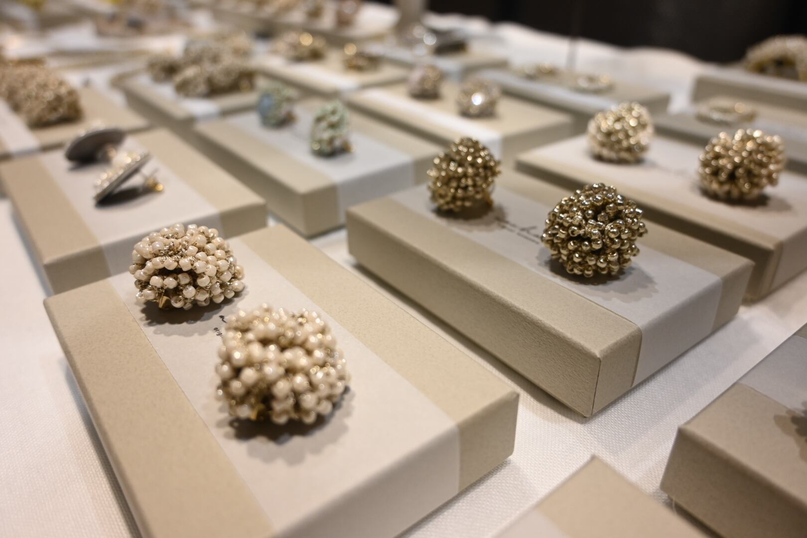 ゴールドのレース糸でビーズを編み込み、繊細でボリューム感たっぷりなピアスを作りました。