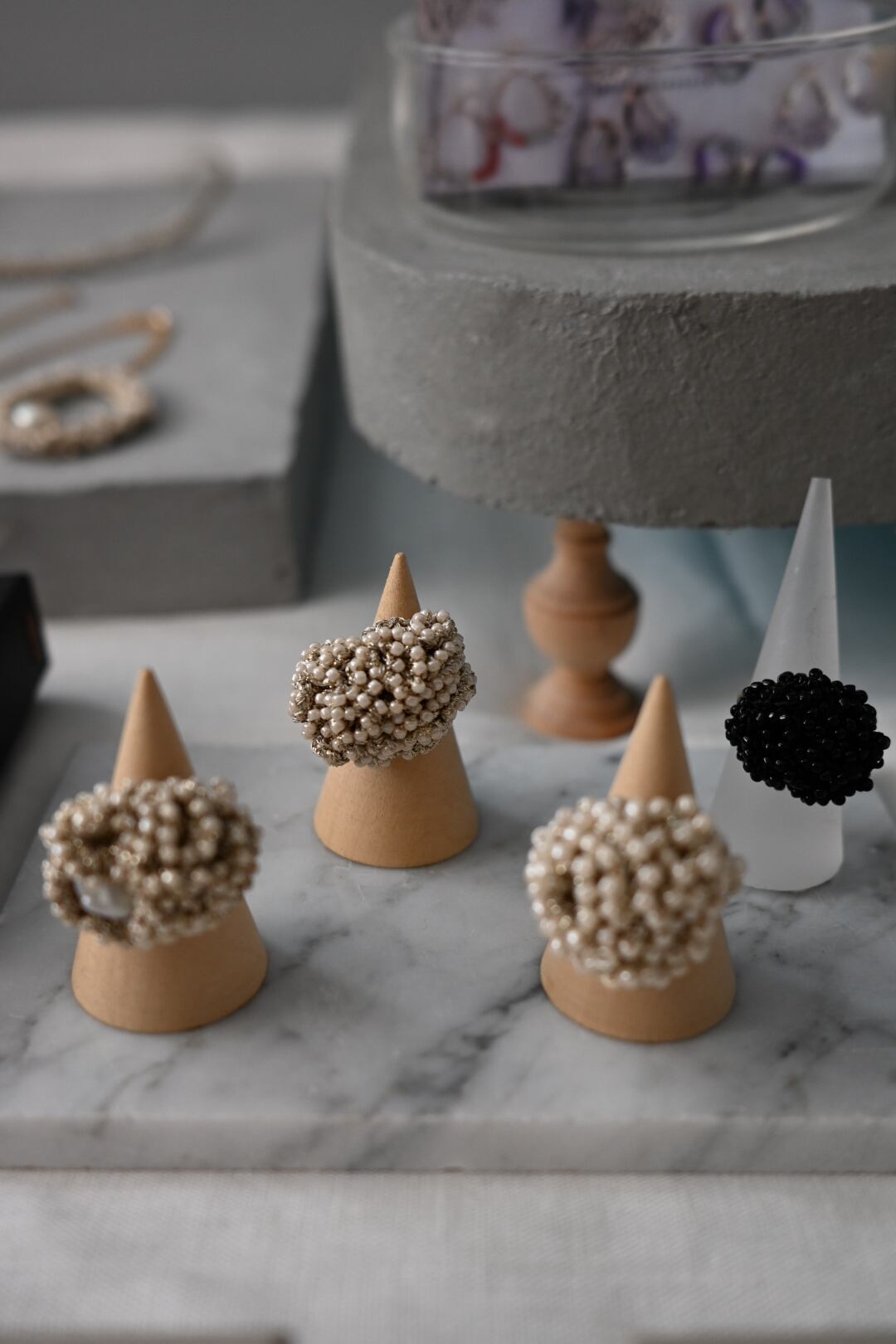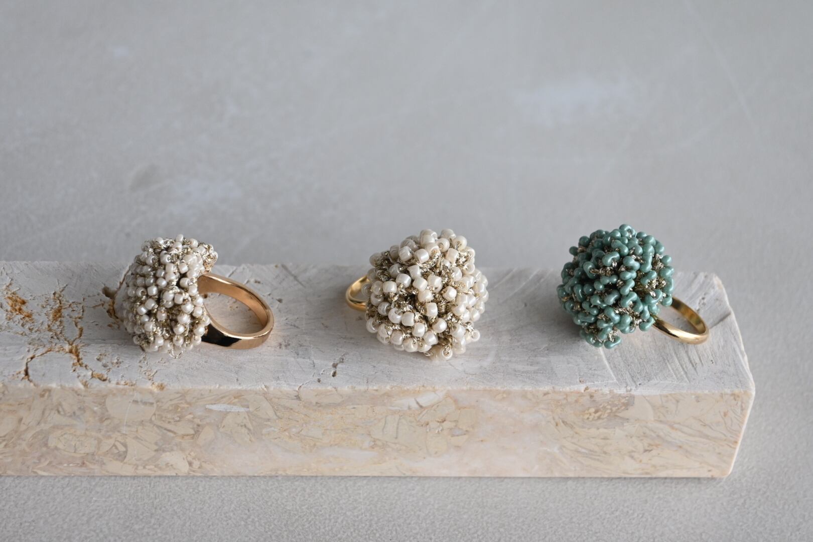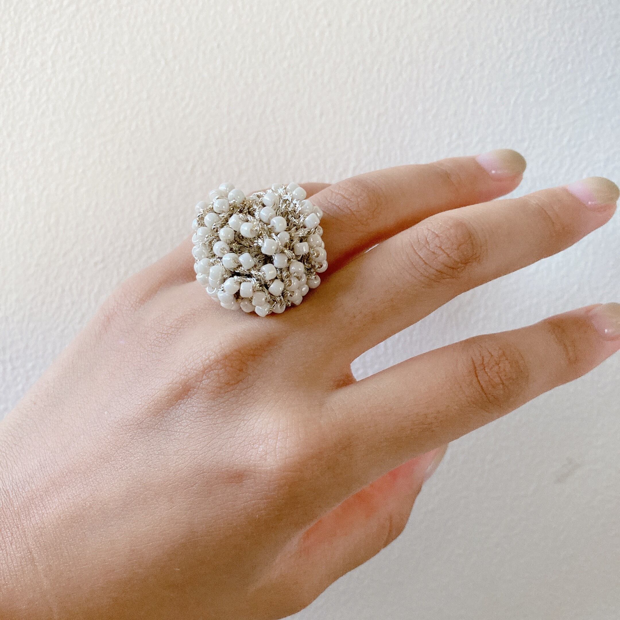 ゴールドのレース糸でビーズを編み込み、繊細でボリューム感たっぷりなリングを作りました。