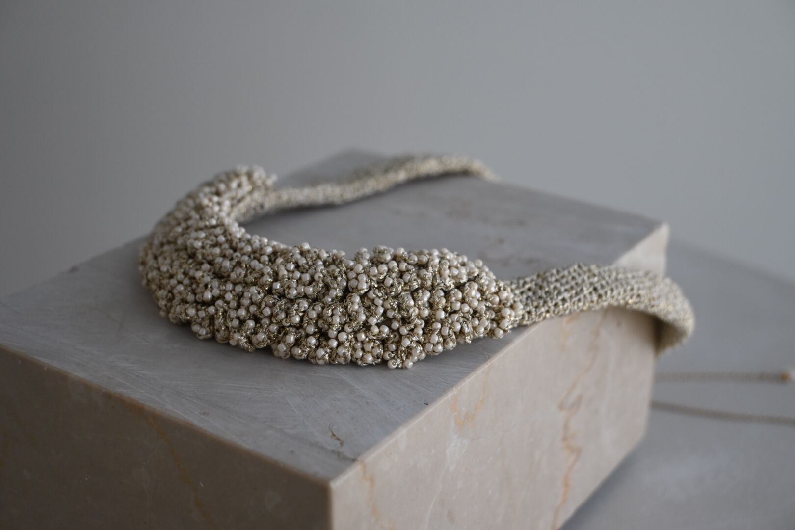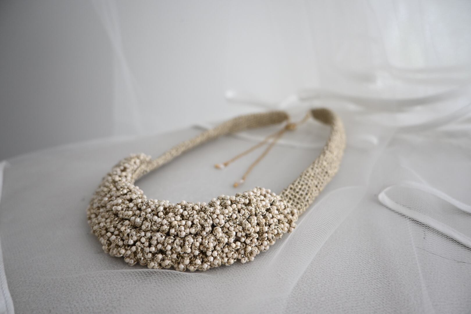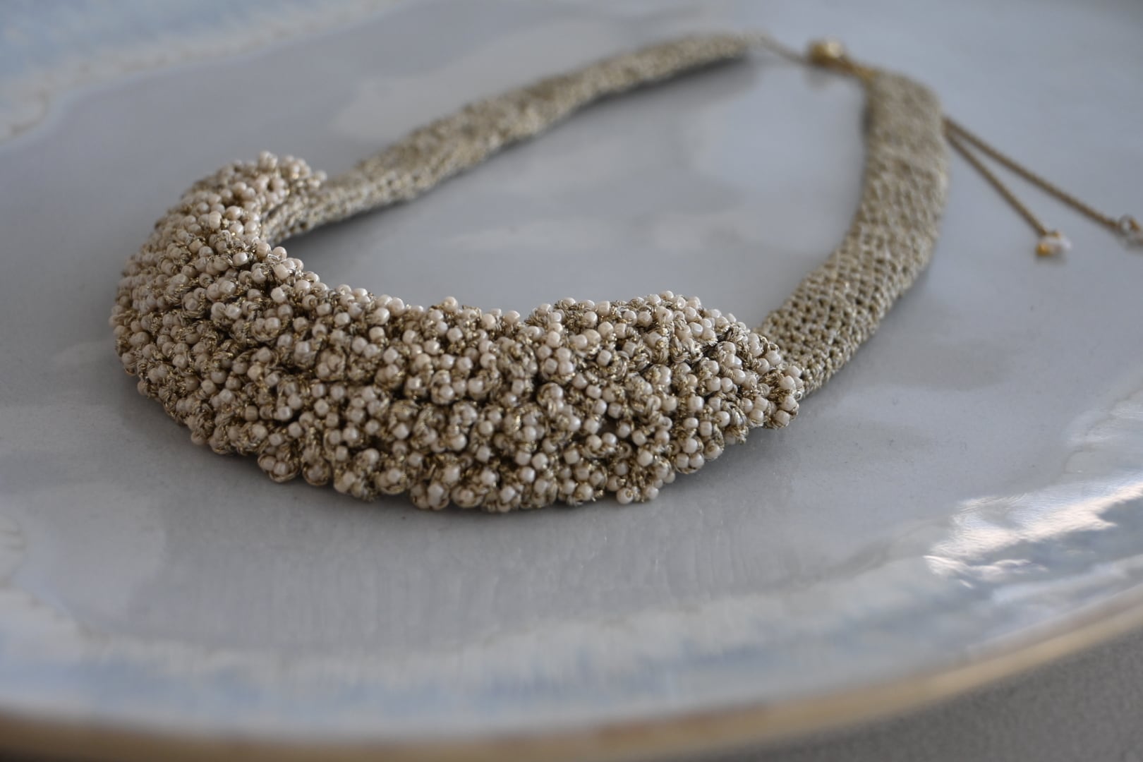 ビーズが不規則に見えるように工夫して、400粒以上のビーズをひとつひとつ丁寧に編み込みました。
