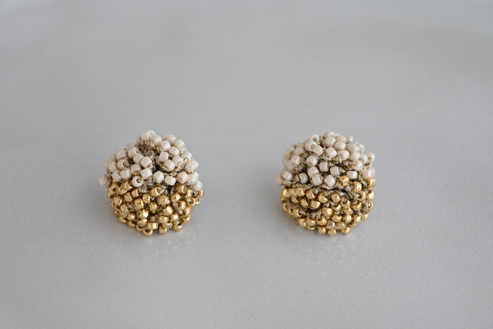 ゴールドのレース糸でビーズを編み込み、繊細でボリューム感たっぷりなピアスを作りました。