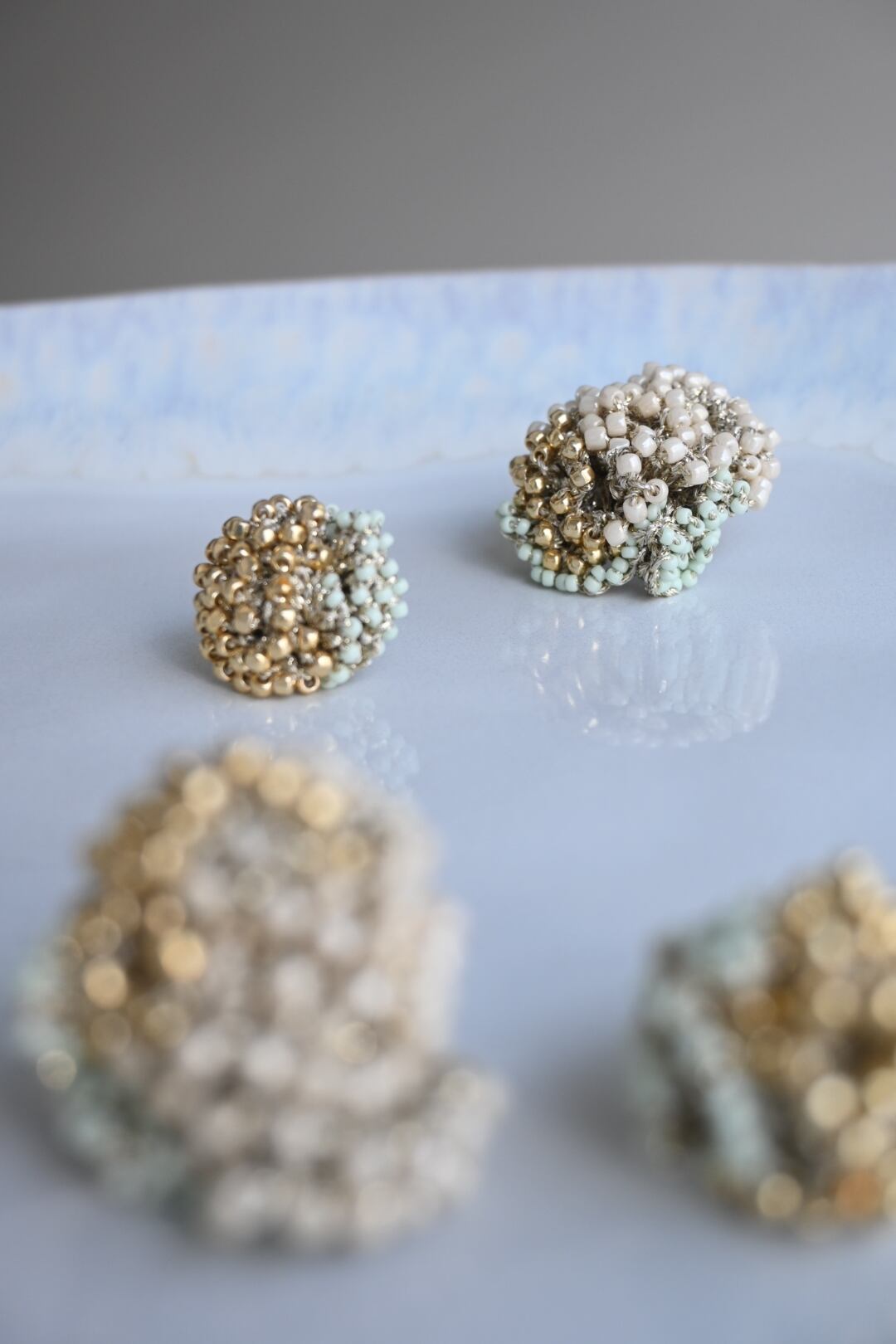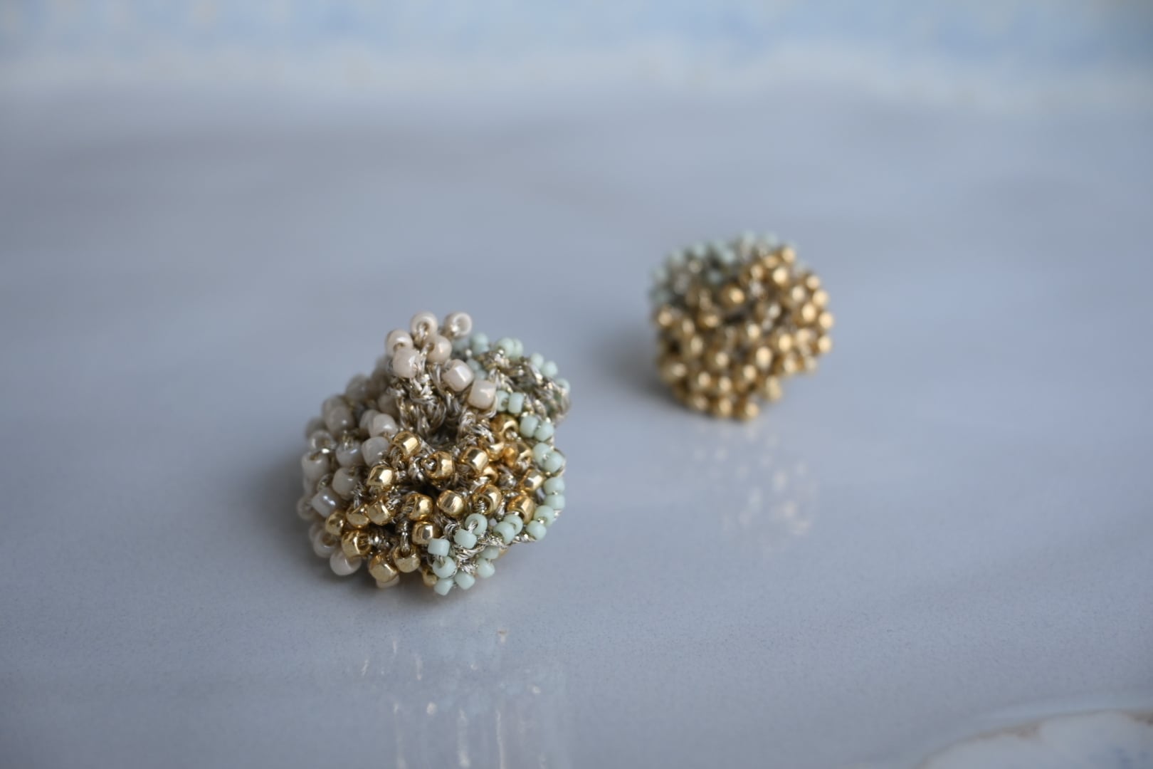 ゴールドのレース糸で3色のビーズを一粒一粒丁寧に編み込んだ繊細でボリューム感たっぷりなピアスです。