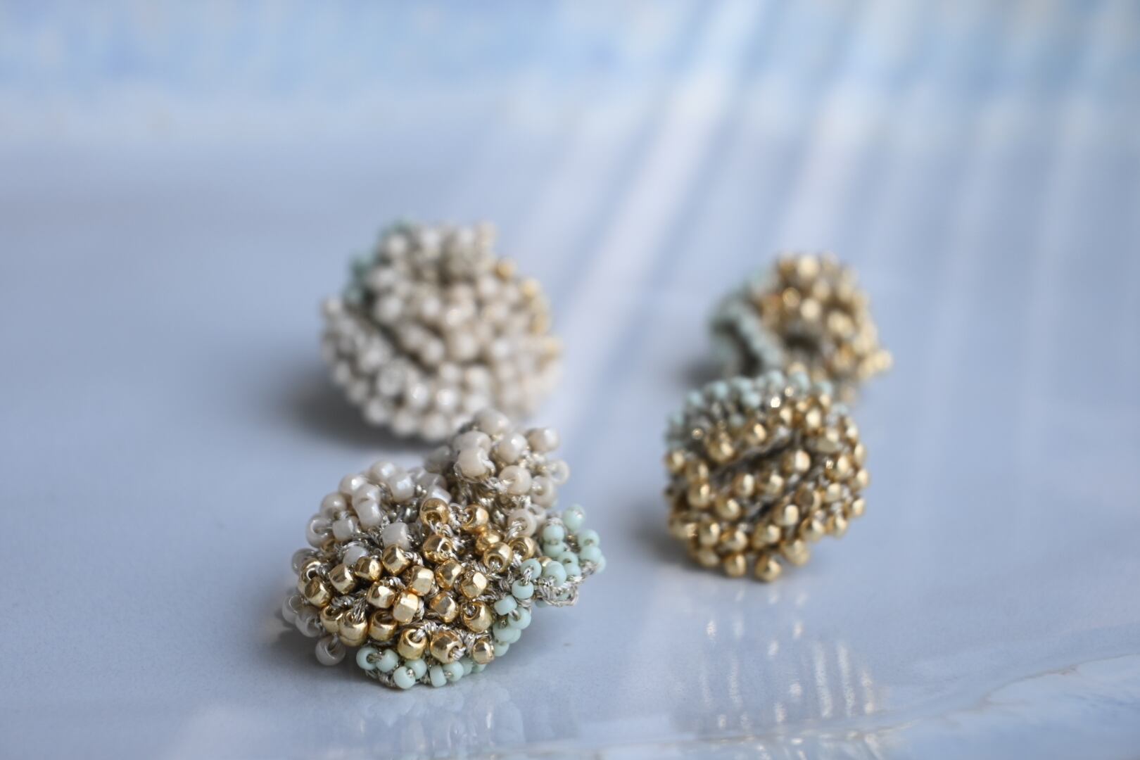 ゴールドのレース糸で3色のビーズを一粒一粒丁寧に編み込んだ繊細でボリューム感たっぷりなイヤリングです。
